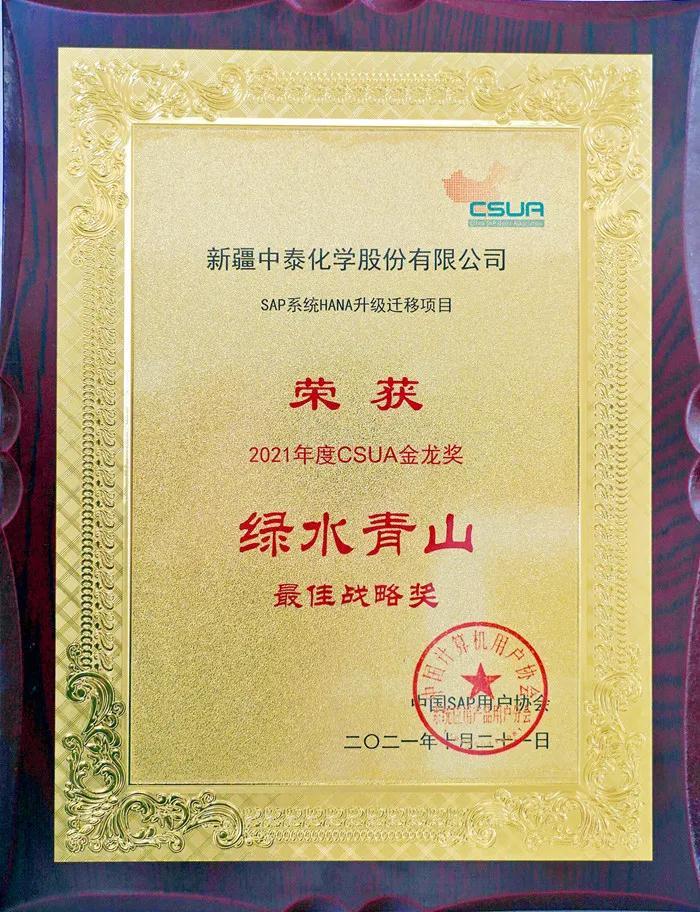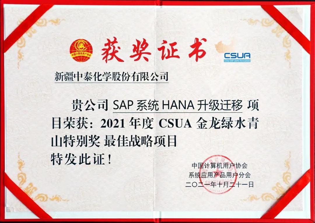 中泰化學SAP系統(tǒng)HANA升級遷移項目榮獲“CSUA金龍綠水青山特別獎 最佳戰(zhàn)略項目”
