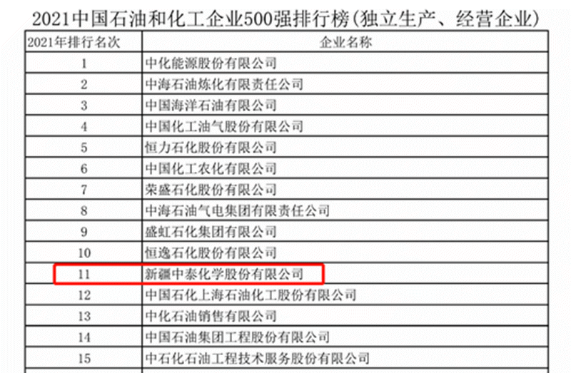 2021中國(guó)石油和化工企業(yè)500強(qiáng)發(fā)布 中泰化學(xué)位列第11位