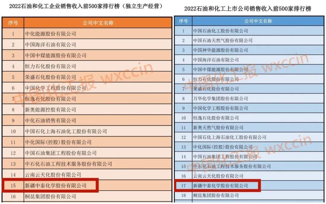 2022石油和化工企業(yè)銷售收入前500家發(fā)布 中泰化學(xué)位列獨立生產(chǎn)經(jīng)營企業(yè)第15位 上市公司第17位