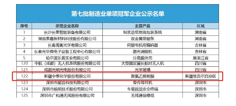 第七批國(guó)家級(jí)制造業(yè)單項(xiàng)冠軍企業(yè)名單發(fā)布 中泰化學(xué)上榜