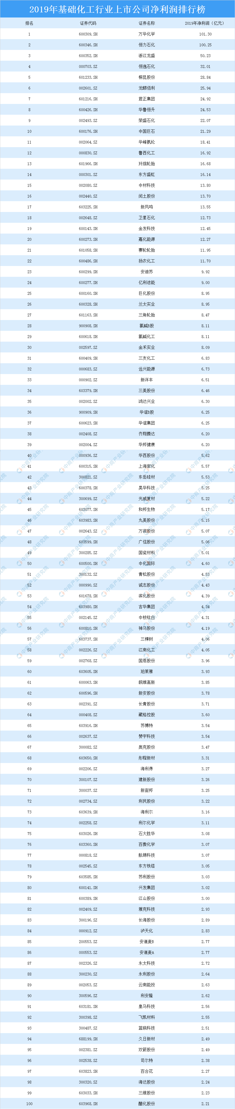 2019年基礎(chǔ)化工行業(yè)上市公司凈利潤前100強(qiáng)