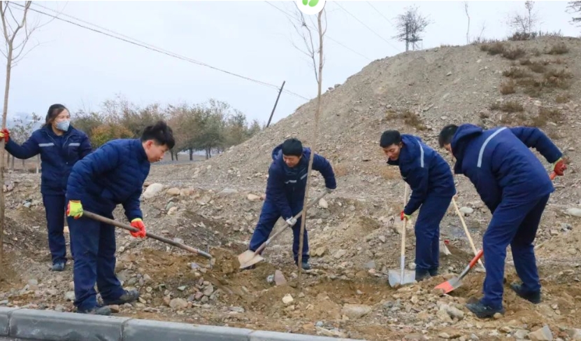 來到植樹地點,攜著泥土芬芳的寒氣撲面而來,大家扛起鐵鍬,根據(jù)任務(wù)分工,井然有序地開始了植樹活動。只見大家配合默契,三人一組,有的負責填土,有的負責拿樹苗,熱火朝天的氛圍很快就驅(qū)散了寒氣。這一畫面,讓筆者聯(lián)想到十幾年前中泰礦冶初建時樹木種植的場景,跨越時間的長河重疊在一起。在中泰礦冶這片熱土上,一棵棵綠樹挺拔,但這里也曾是“黃沙遮天日,飛鳥無棲樹”的荒涼戈壁,可見植樹造林是一件很有意義的事情,是一項功在當代、利在千秋的崇高任務(wù)。
