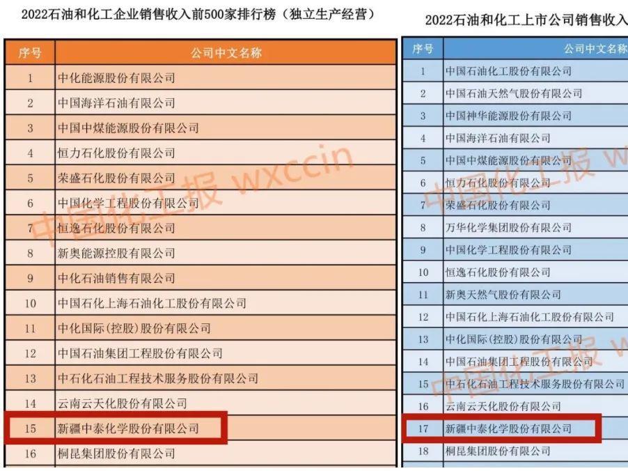 2022石油和化工企業(yè)銷售收入前500家發(fā)布 中泰化學(xué)位列獨立生產(chǎn)經(jīng)營企業(yè)第15位 上市公司第17位