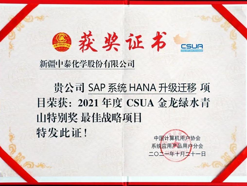 中泰化學SAP系統(tǒng)HANA升級遷移項目榮獲“CSUA金龍綠水青山特別獎 最佳戰(zhàn)略項目”