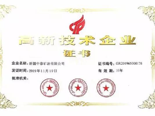 中泰礦冶有限公司榮獲新疆維吾爾自治區(qū)“高新技術(shù)企業(yè)”榮譽稱號